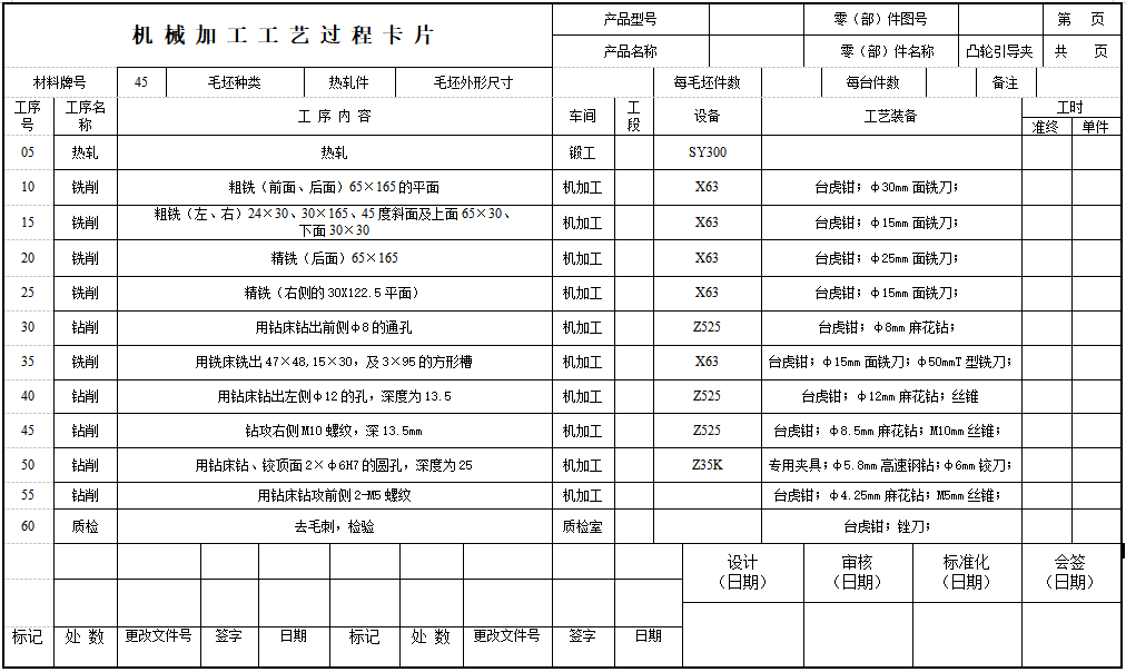 针对车凸轮工具引导夹的加工,钻2×Ф6H7孔的精度是关键。为此设计的钻床夹具,通过精确定位与可靠夹紧,确保了两孔的位置度与尺寸要求。这套学习资料包含了详尽的工序卡与过程卡,配合图纸,清晰展示了从工艺分析到夹具结构设计的全过程,为同类工序的夹具设计提供了实用的参考思路,能显著缩短工艺准备时间。