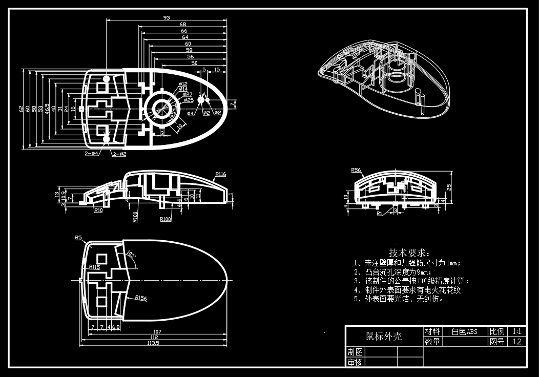 鼠标外壳注射模设计是塑料成型领域的一项典型应用。其核心在于通过合理的分型面选择、浇注系统与冷却系统布局,确保制品外观平整、尺寸稳定且脱模顺利。严谨的模具结构设计能有效控制熔接痕位置,避免缩痕变形,从而保障外壳的装配精度与手感。相关的学习资料通常包含模具总装图、零件图及设计分析,完整呈现了从三维模型到可加工图纸的实现过程,对理解复杂曲面产品的模具设计有重要参考价值。