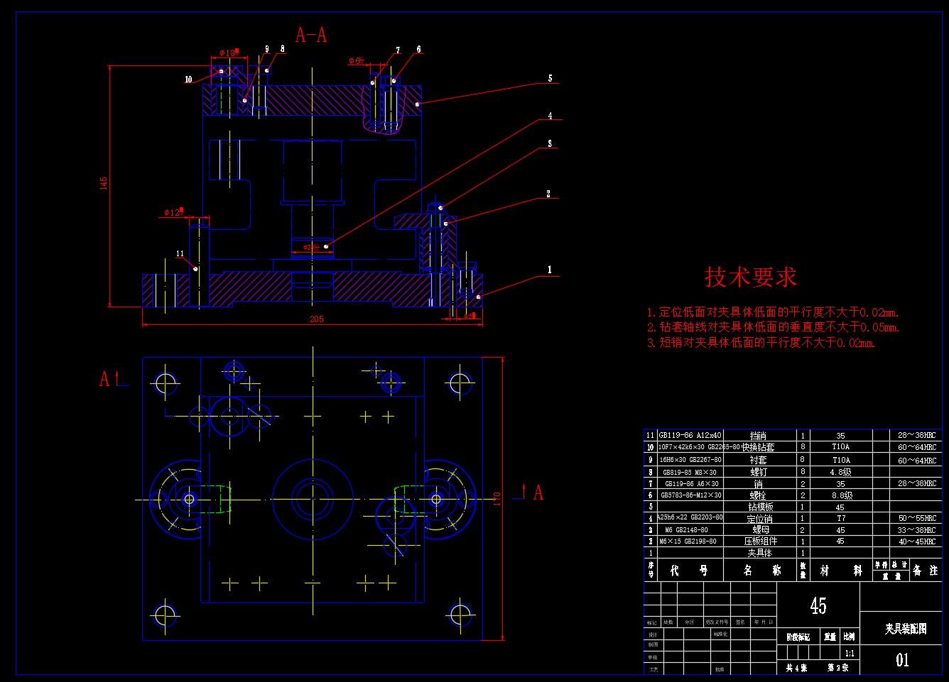 方刀架加工工艺部分,规范了从粗加工到精加工的步骤,确保各面精度和位置公差。钻8-M12螺纹底孔夹具设计,通过定位装置和夹紧机构,实现工件快速装夹,提升钻孔稳定性。5张CAD总图清晰呈现工艺路线和夹具结构,是了解方刀架加工与夹具设计的实用资料。