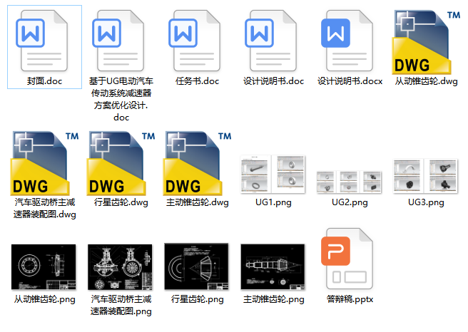 基于UG电动汽车传动系统减速器方案优化设计【说明书(论文)+任务书++CAD图纸+答辩稿】备注:此份资料含有UG绘图的预览图片,但是不含UG模型
