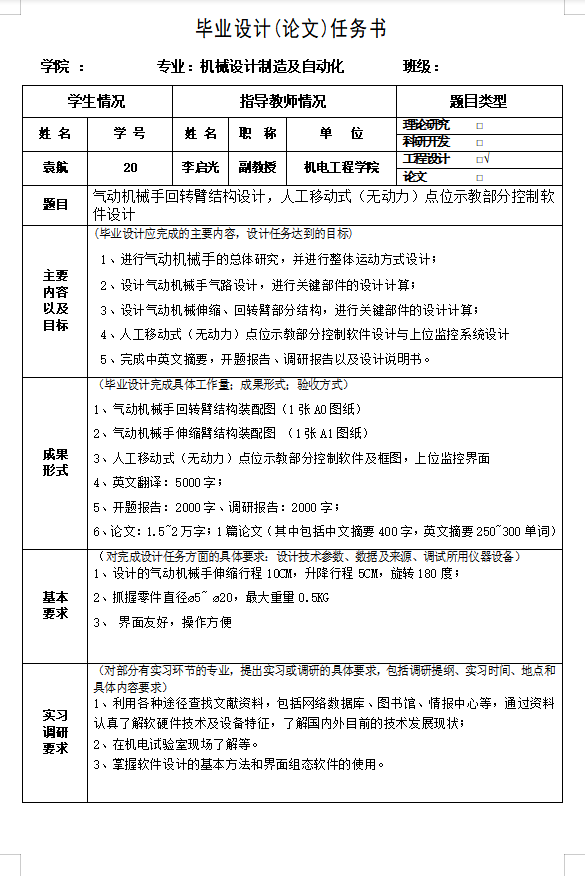 气动机械手回转臂结构设计,人工移动式(无动力)点位示教部分控制软件设计(论文+CAD图纸+开题报告+任务书……)