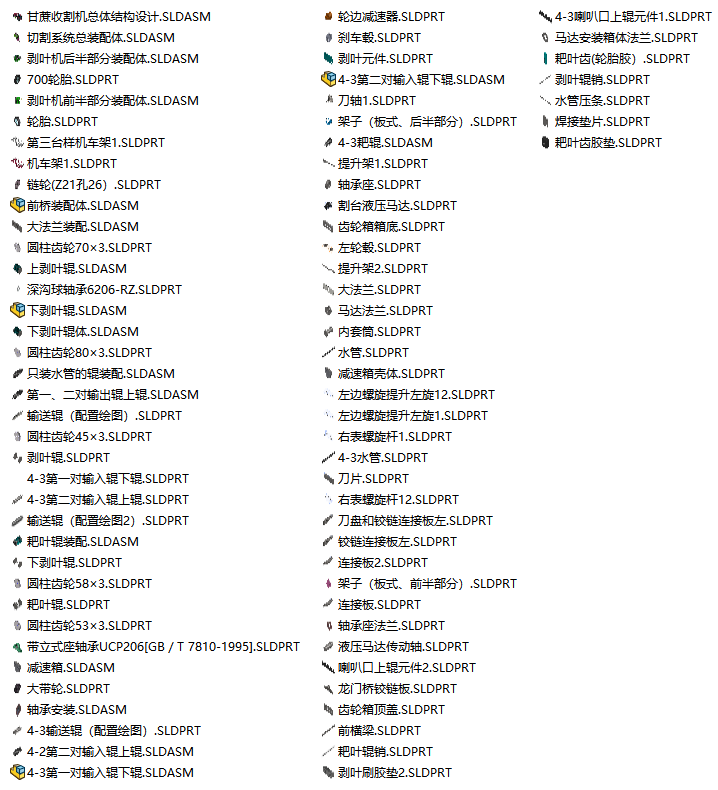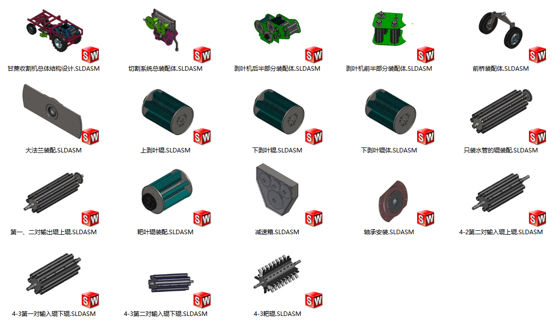甘蔗收割机的设计资料包含论文、CAD图纸、SolidWorks三维图、开题报告及外文翻译。这套资料系统展示了从理论分析到三维建模的完整设计流程,对理解农业机械结构设计具有参考价值。其中,三维模型直观反映了各部件间的装配关系,二维图纸则清晰表达了关键尺寸与技术要求。这些内容有助于显著缩短类似项目的研发周期,并有效减少设计过程中的错误。相关学习资料为从事农机设计提供了实用的技术参考。