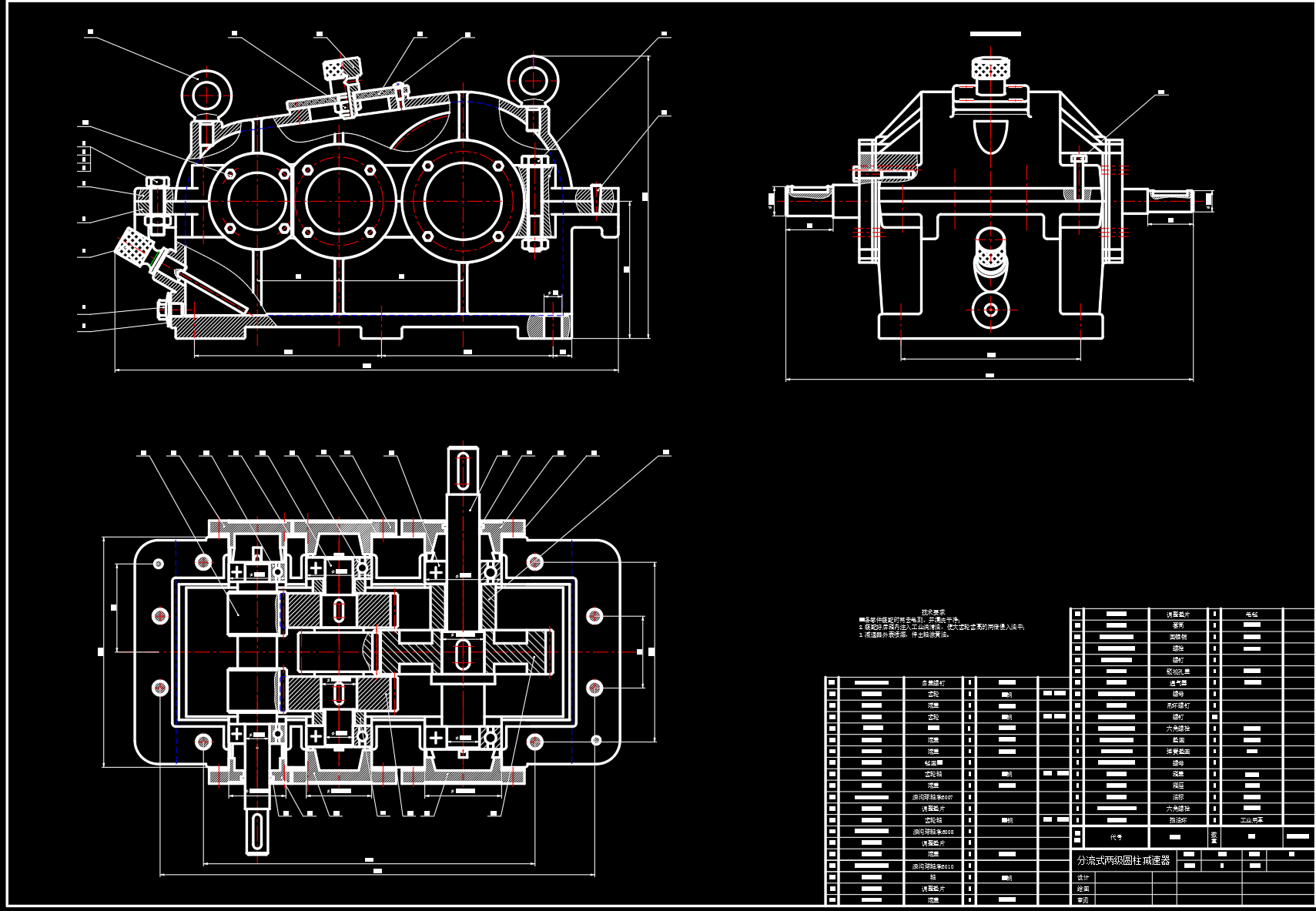 这张分流式两级圆柱减速器CAD装配图,清晰呈现两级圆柱齿轮的啮合关系、轴系部件的装配结构,以及箱体与零件的定位方式。作为实用资料,它直观展示动力分流设计通过齿轮副传递扭矩的过程,帮助理解减速增扭原理,为零件选型、装配工艺提供参考,避免过多零件干涉,是机械设计中理解分流式传动结构的有效工具。