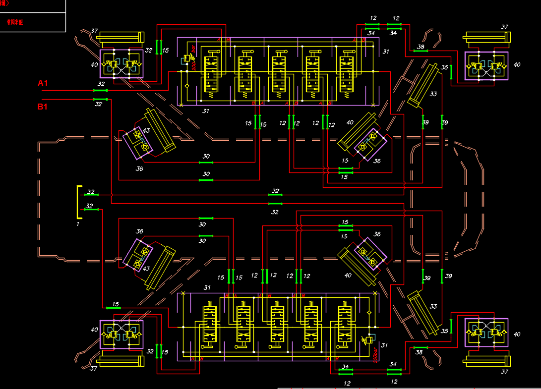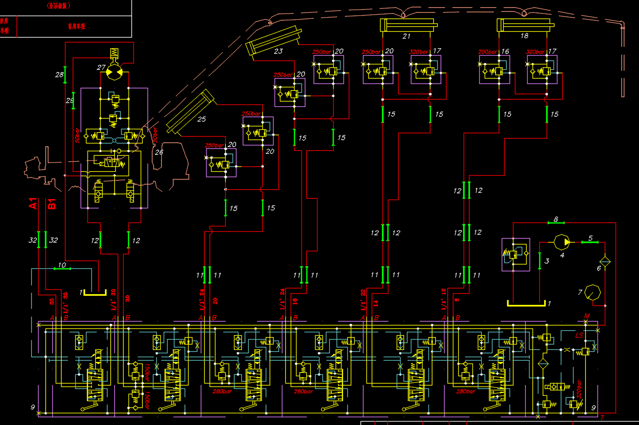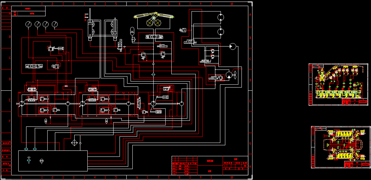 泵车液压原理图用CAD画出来,能把液压系统里的元件怎么连、怎么工作说清楚。图里标着油管走向、阀门控制方式,帮着看懂各部分怎么配合。安装调试时照着图查问题,维护时对着图找零件,用起来方便。这样的学习资料,对理解泵车液压原理挺实用的。