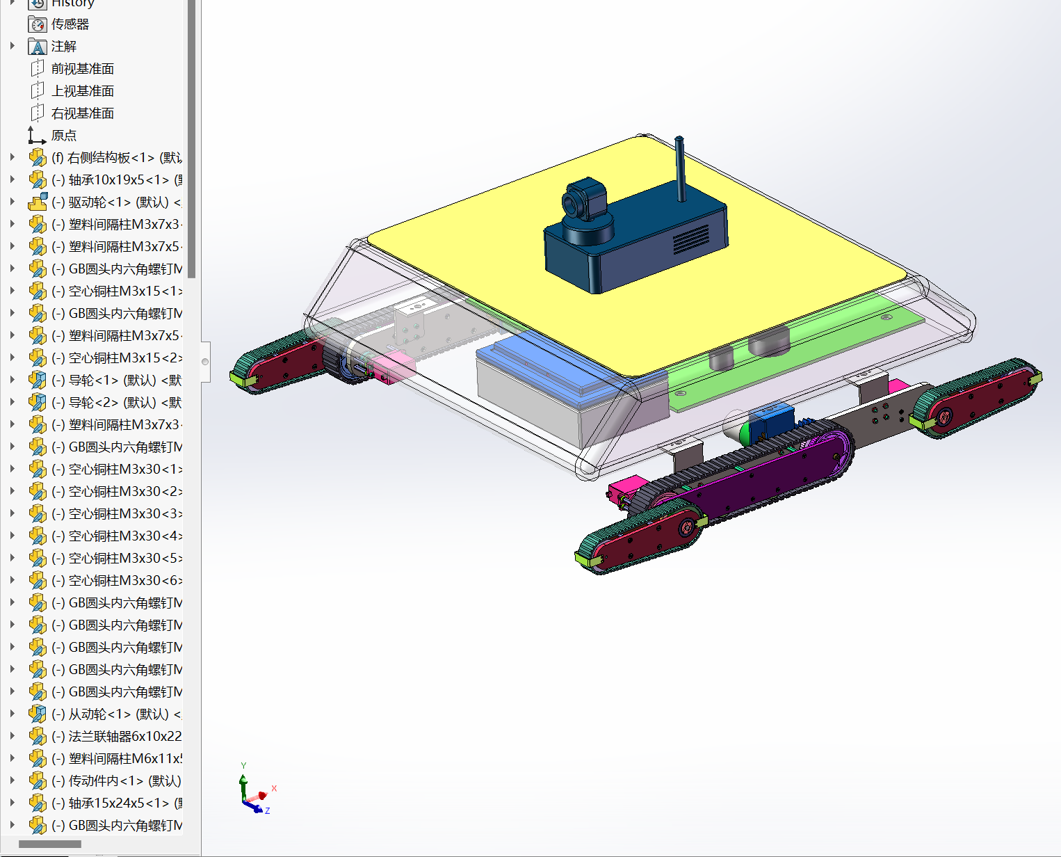 双摇臂全地形履带小车在SolidWorks中完成三维建模,其核心在于通过双摇臂独立悬挂结构,赋予小车卓越的地形适应能力。模型精确展现了履带与摇臂的协同运动关系,确保在复杂崎岖路面上能有效保持履带接地压力与车身稳定。这一三维成果为后续的结构分析与优化提供了直观可靠的数字基础,显著缩短了从概念到实物的开发周期。相关学习资料有助于深入理解其运动机构与设计要点。