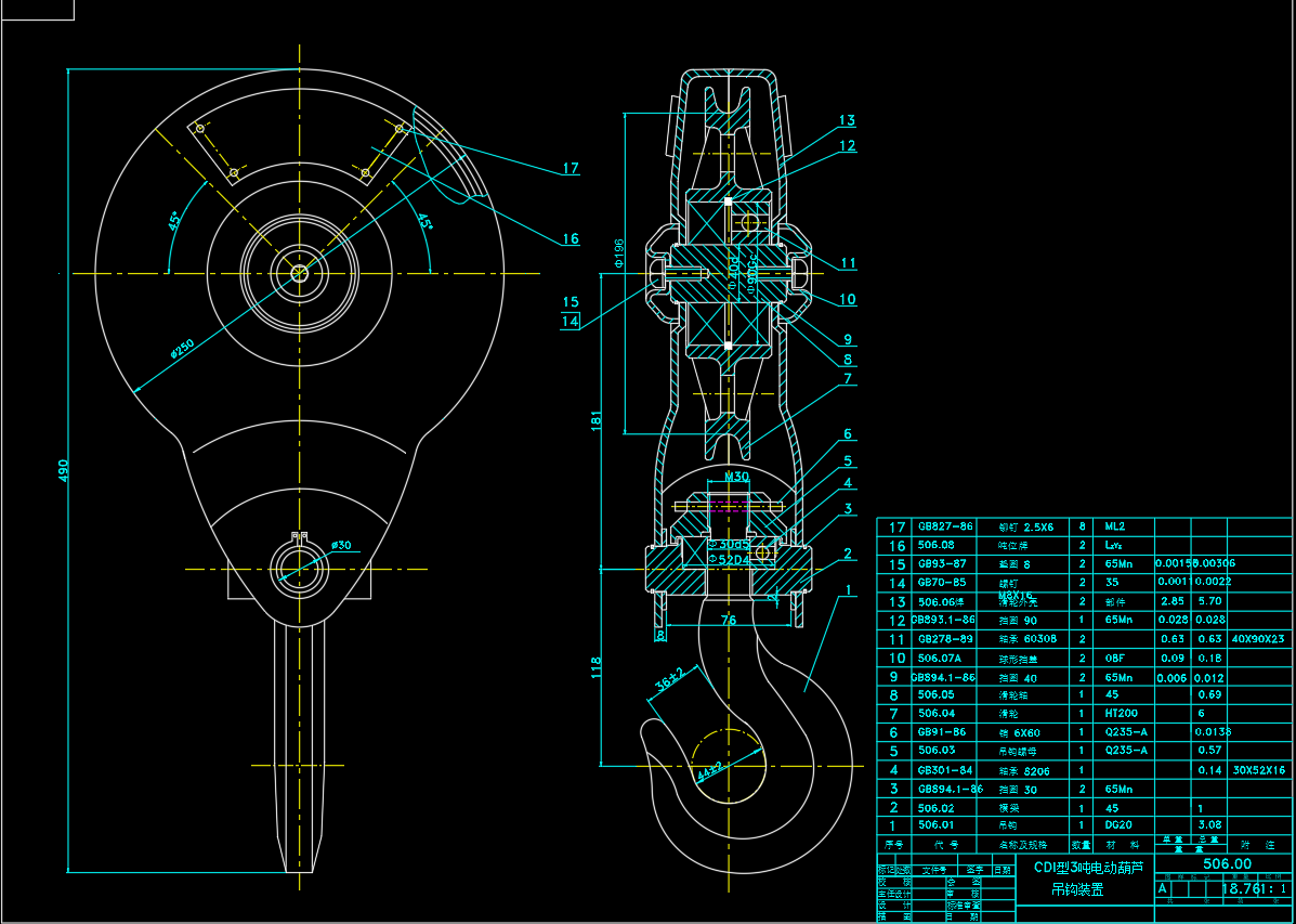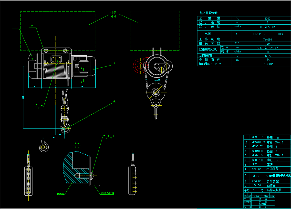 CDⅠ型1吨电动葫芦全套CAD图纸(总装配图+部件装配图+零件图+标准件汇总表+明细表)